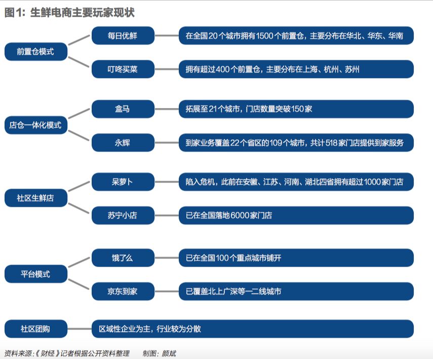 目前市面上的生鲜电商主要有四种模式,分别为社区生鲜店、社区团购、前置仓模式和店仓一体化模式,此外还有饿了么、京东到家等平台,虽不直接经营生鲜品,但吸纳了不少线下生鲜店甚至菜市场摊主,提供引流和配送服务。
