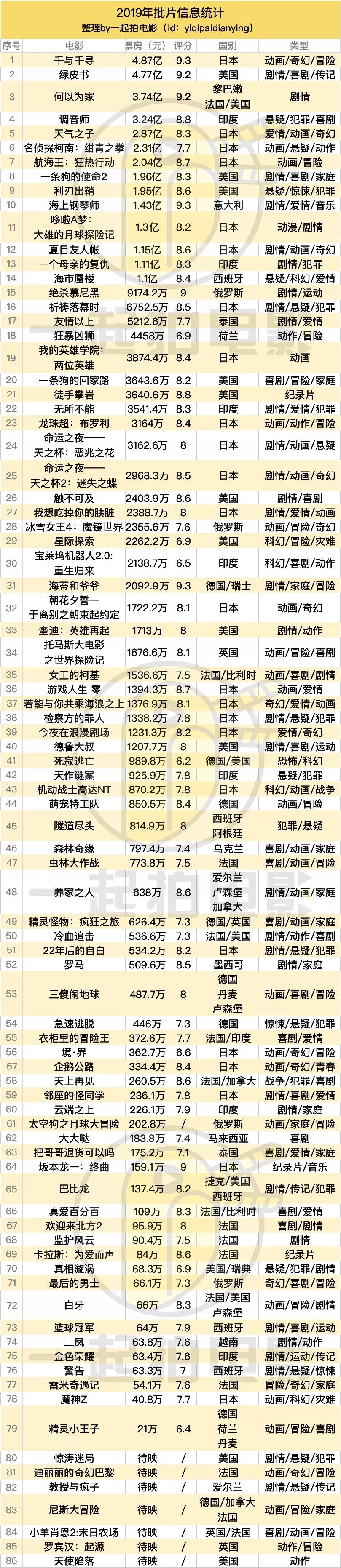 其实不仅仅印度电影,从本年批片商场的全体体现来看,虽然爆款频出,但多以《绿皮书》《何认为家》《调音师》等“小爆款”居多,像《摔跤吧!爸爸》等从前超10亿的大爆款著作却缺席不在,乃至是超5亿著作相同缺失,商场最为卖座的是4.87亿的《千与千寻》。