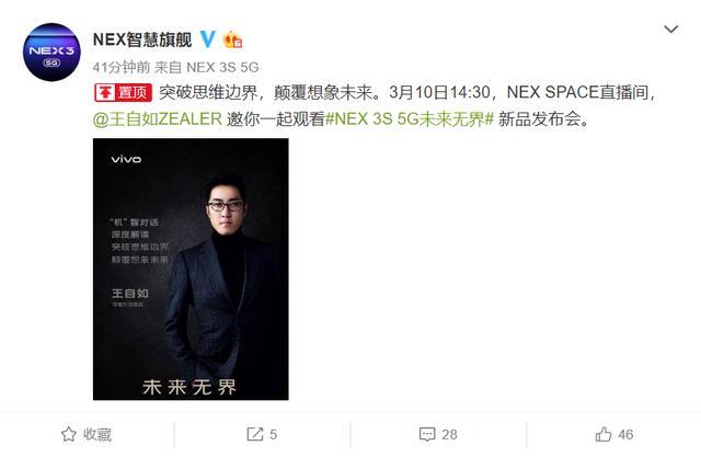 要说2019年最令人冷艳的机型,那么vivo NEX 3 5G必定位居前列。而近来NEX官微又放出了一则重磅音讯,新品vivo NEX 3S 5G确定于3月10日正式发布,而且发布会上会约请闻名科技圈KOL@王自若ZEALER 与用户一同观看新品发布会。