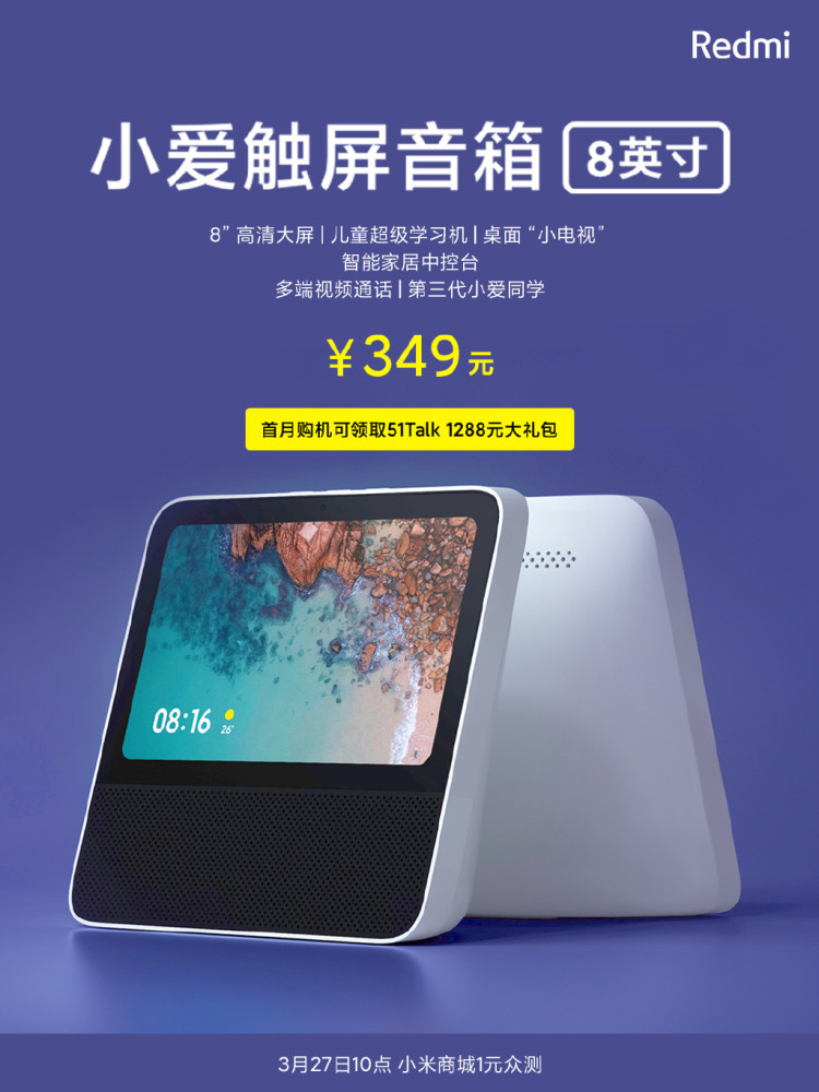 【环球网科技归纳报导】3月24日,在Redmi K30 Pro发布会期间,Redmi红米手机发布Redmi小爱触屏音箱8英寸版,定价349元,将8英寸带屏AI音箱带入300元年代。这款新品现已敞开预定,将于3月27日10点开卖,首月购买的用户还能够收取51Talk 1288元大礼包。